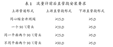 (3)流量計在安裝時其上游和下游應(yīng)配置一定長度的直管段,其長度應(yīng)滿足表1的要求。