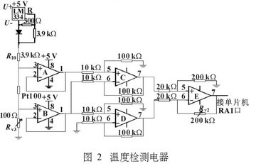 此時(shí)有U7E=100UiA-200IB,電位器Rv3用來調(diào)零,當(dāng)其阻值調(diào)至和Pt100阻值相同時(shí),此時(shí)U7E為零,未調(diào)整時(shí)即為常溫值。其原理如圖2所示.