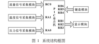 渦輪流量計(jì)系統(tǒng)以PIC單片機(jī)為控制核心,包括流量信號(hào)采集模塊、溫度和壓力信號(hào)采集模塊、鍵盤以及顯示模塊5個(gè)部分。流量信號(hào)采集模塊使用渦輪流量計(jì)采集流量信號(hào),經(jīng)過外圍電路處理后送入單片機(jī),測(cè)量其頻率,用于流量計(jì)算;溫度和壓力采集模塊將采.集到的溫度和壓力通過A/D轉(zhuǎn)換后送入單片機(jī),用.于氣體的密度計(jì)算,對(duì)氣體流量進(jìn)行補(bǔ)償;鍵盤模塊實(shí)現(xiàn)對(duì)儀表參數(shù)的設(shè)置、各顯示內(nèi)容之間的轉(zhuǎn)換操作;顯示模塊實(shí)現(xiàn)瞬時(shí)流量、累積流量、溫度和壓力的顯示。系統(tǒng)的總體結(jié)構(gòu)圖如圖1所示。