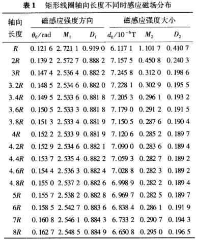 對于電磁流量計中的矩形線圈,將所考慮橫截面區(qū)域劃分成41x41個網(wǎng)格,令矩形線圈的寬為6cm,等于管道內徑2R。每個勵磁線圈的匝數(shù)為6,厚度為2cm,2個線圈之間的距離為6cm,緊貼測量管壁,線圈中電流強度為10mA。首先令矩形線圈軸向長度的范圍從R到8R,間隔為R;其次,在前面所確定最優(yōu)尺寸4R附近,提高尺度分辨率,從3R到5R,間隔為0.2R??疾榫匦尉€圈在測量管橫截面上的感應磁場分布情況,如表1所示。