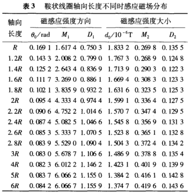 取鞍狀線圈圓弧段的弧度為154°,首先取線圈的軸向長度范圍R~6R,間隔為R;其次在最優(yōu)尺寸2R附近,提高尺度分辨率,從R到3R,間隔為0.2R。考查鞍狀線圈在電極橫截面上的感應磁場分布情況,如表3所示。