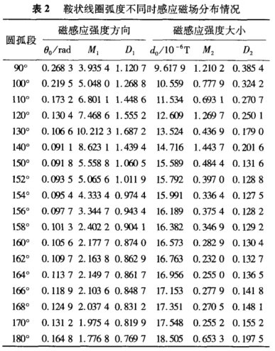 由表2可知,當鞍狀線圈圓弧段的弧度為154°時,D2達到最小值,D、取值0.9744,同時感應磁場方向指標θ。為0.0954,與最小值0.0911相差不大,綜合考慮選鞍狀線圈圓弧段的最優(yōu)弧度為154°。
