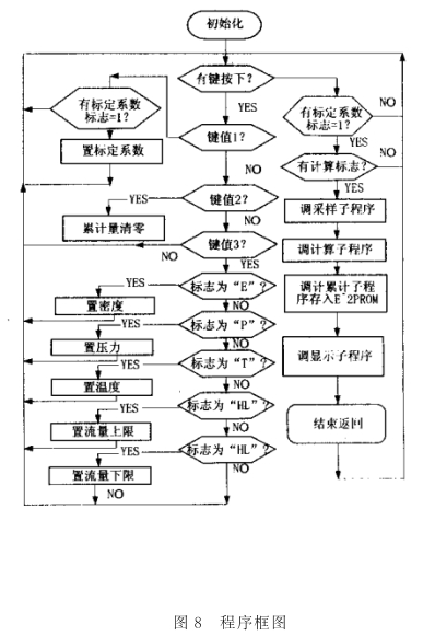軟件設(shè)計流程如圖8所示??蓪崿F(xiàn)雙排8位LCD同時顯示累積流量和瞬時流量;通過儀表界面3個按鍵可將標定曲線系數(shù)、小數(shù)位數(shù)、被測介質(zhì)的密度、溫度、壓力、壓縮系數(shù)等工況參數(shù)直接置入單片機,自動完成刻度換算,實現(xiàn)流量的精確測量,給不同要求用戶的使用帶來極大方便,無需逐臺設(shè)計制造,與國際同類研究成果相比較,金屬管浮子流量計顯示出更強的智能化水平。