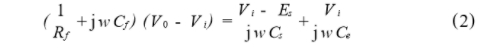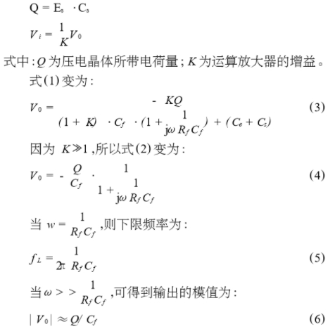 式中:Rƒ為反饋電阻;Cƒ為反饋電容;V0為輸出電壓;Vt為輸入電壓;Es為壓電晶體產(chǎn)生的等效電壓;Cs為信號源等效電容;Ce為電纜之間的分布電容。
