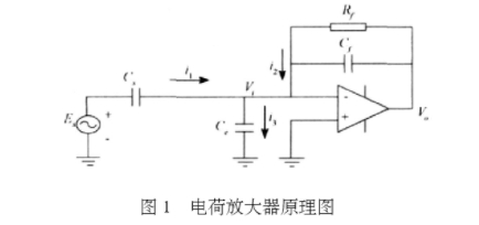 壓電式渦街流量計的工作原理是:當(dāng)流體流過渦街發(fā)生體的時候在流體中產(chǎn)生旋渦,旋渦產(chǎn)生向.上的升力,檢測元件把受到的升力以應(yīng)力形式作用在壓電晶體元件上,轉(zhuǎn)換成交變的電荷信號,經(jīng)電荷放大、濾波、整形后得到旋渦頻率信號。電荷放大電路的核心是將壓電晶體.上受力產(chǎn)生的電荷轉(zhuǎn)換成電壓信號。其電路結(jié)構(gòu)如圖1所示。