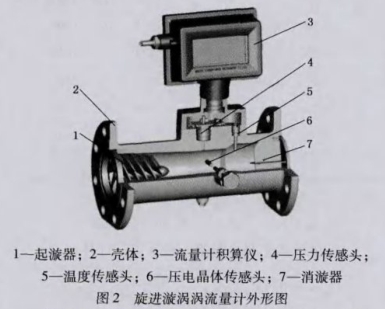 旋進(jìn)漩渦流量計(jì)主要由起旋器、文丘里管、消旋器和檢測(cè)元件組成。其結(jié)構(gòu)原理如圖1所示,外形如圖2所示,當(dāng)流體流進(jìn)旋進(jìn)漩渦流量計(jì)后,在起旋器的作用下,被強(qiáng)制圍繞中心線旋轉(zhuǎn),產(chǎn)生漩渦流,漩渦流在文丘利管中旋進(jìn),到達(dá)收縮段突然節(jié)流后,使漩渦流加速,當(dāng)通過擴(kuò)散段時(shí),漩渦中心沿一錐形旋線進(jìn)動(dòng)。此時(shí),由兩個(gè)壓電傳感器檢測(cè)到的進(jìn)動(dòng)頻率信號(hào)經(jīng)前置電路放大,濾波,整形后轉(zhuǎn)換為兩路與流速正比的脈沖信號(hào),經(jīng)積算儀中處理電路進(jìn)行相應(yīng)的比較和判斷,并剔除外來干擾信號(hào)后,正常的流量信號(hào)與溫度,壓力傳感器檢測(cè)到的信號(hào)-起送人智能流量積算儀進(jìn)行運(yùn)算處理,并把流體的體積流量和總量直接顯示于LCD屏上。
