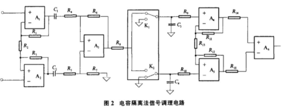 現(xiàn)在很多電磁流量計的信號處理方法采用了電容隔離法,電容隔離法是將零點漂移近似作為直流.處理的一種方法,即通過電容耦合來隔離零點漂移干擾,實現(xiàn)對感應(yīng)電勢信號的提取.放大處理.基本電路如圖2.