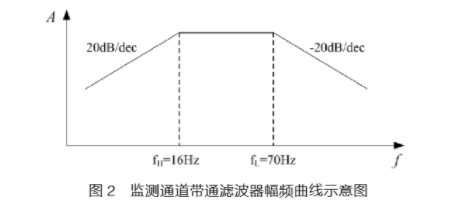 為監(jiān)測信號由低頻突變?yōu)楦哳l時的狀況,渦街流量計設(shè)計了一個由轉(zhuǎn)折頻率為fL=fmax/2=70Hz的一階低通濾波器與轉(zhuǎn)折頻率為fH=8*fmin=16Hz的一階高通濾波器組成的帶通濾波器作為“監(jiān)測通道”。圖2為“監(jiān)測通道”的幅頻曲線示意圖。