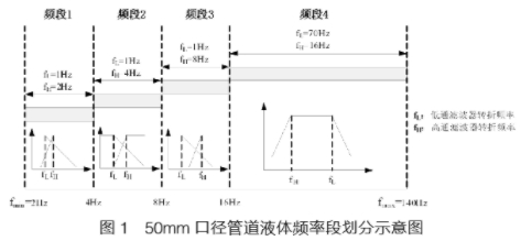 在低頻段,渦街信號經(jīng)過相同轉(zhuǎn)折頻率的低通濾波器,輸出幅值為常數(shù);在高頻段,低通濾波器轉(zhuǎn)折頻率后移,使低通濾波器基本放開。圖1為50mm口徑管道液體的頻率段劃分示意圖。此四頻段信號處理方法構(gòu)成的“測量通道”是整個渦街信號處理體系的主體通道。