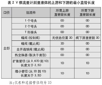 (2)液體測(cè)量,雷諾數(shù)范圍(Re)>200000,V錐流量計(jì)測(cè)量液體的上游和下游的最小直管長(zhǎng)度見表2。若≥0.65,表中的直管段長(zhǎng)度需要增加1D.。