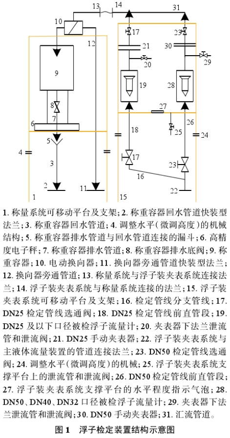 裝置設置2個檢定臺位,DN25以下包括DN15、DN20和DN25為一~條管線,另一個為DN32、DN40和DN50浮子流量計檢定臺位。采用變換管段的方式,在有限的2個工作臺位上覆蓋了DN15~DN50所有管徑浮子流量計的檢定能力。一個臺位工作的同時可在另一個臺位安裝被檢表,可有效提高檢定效率。