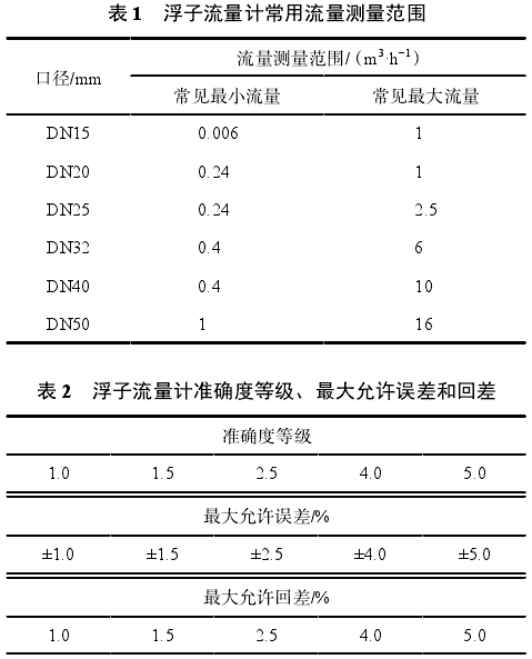 金屬管浮子流量計被廣泛應用于小管徑、低流速測流領域。以液體為例,口徑10mm以下玻璃管浮子流量計滿度流量的名義管徑,流速只在0.2~0.6m/s之間,甚至低于0.1m/s8。常用浮子流量計口徑為DN15~DN50,對應的流量范圍和準確度等級分別見表1和表2。