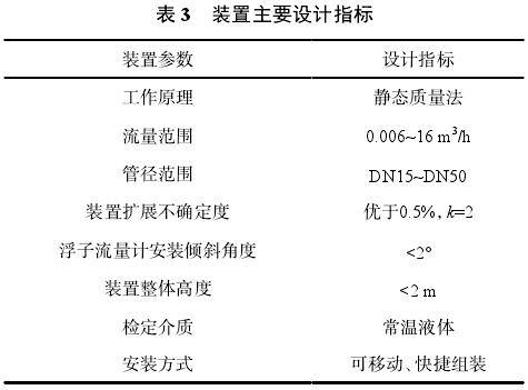 根據(jù)常用流量計口徑、準確度等級和流量測量范圍進行裝置設計,具體設計指標見表3。裝置設計采用測量精度較高的靜態(tài)質量法,流量范圍0.006~16m2/h,滿足常用口徑DN15~DN50液體浮子流量計檢定需求。浮子流量計檢定裝置的擴展不確定度應優(yōu)于被檢流量計最大允許誤差的1/2凹最高準確度等級浮子流量計為1.0級(表2),因此組合裝置的擴展不確定度應優(yōu)于0.5%。為保證測量準確性,浮子流量計安裝傾斜角度應<2°。為了方便裝置的移動、拆卸和高效組裝,整套裝置高度應不超過2m。
