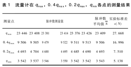 采用A類方法進行評定。按照檢定規(guī)程要求,流量計分別在qmax、0.4qmax、0.2qmax、qmin各流量點進行6次重復(fù)測量,如表1所示。一般在測量次數(shù)較少時,可采用極差法獲得實驗標準差[2]口流量計脈沖數(shù)的測量值滿足正態(tài)分布,本次測量次數(shù)為6次,不大于9次,采用極差法得到實驗標準.差s(N)。