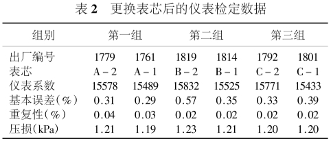 由表3中數(shù)據(jù)可以看出,渦輪流量計(jì)的儀表系數(shù)主要和表芯有關(guān),這是由于表芯幾乎集中了該表的所有重要零部件,包括影響儀表性能的軸承和葉輪。渦輪流量計(jì)一次表的損壞主要是軸承和葉輪,因此既不提倡單獨(dú)更換軸承或葉輪進(jìn)行維修,也不需要更換整臺儀表,而是采用整體更換表芯的方式即可。每一個用于維修的表芯都需要進(jìn)行單獨(dú)標(biāo)定,每一個表芯都可確定一個儀表系數(shù),更換表芯后,輸入新的儀表系數(shù)就可以投入使用了。