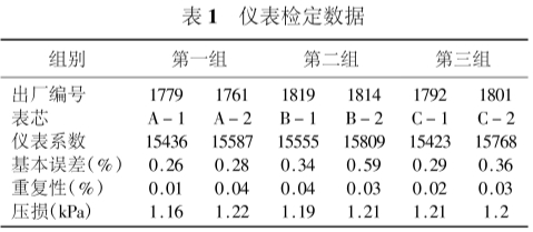 按照規(guī)定,渦輪流量計(jì)出廠前總是逐臺進(jìn)行標(biāo)定,并給出儀表系數(shù)。但在現(xiàn)場,尤其是高壓場合,渦輪表損壞的事時有發(fā)生,維修人員經(jīng)常將表芯(包括葉輪和軸承在內(nèi)的組件)更換,而不是整臺儀表更換,換下的表芯帶回維修(在現(xiàn)場不允許進(jìn)行長時間的維修工作)。由此產(chǎn)生了這樣的疑問:整臺儀表更換與只更換表芯在流量計(jì)的性能方面,尤其是儀表系數(shù)會有什么變化?儀表系數(shù)究.竟和哪些因素有關(guān)?帶著對這些問題的思考,我們隨機(jī)抽取了6臺儀表(口徑均為DN80),每兩臺儀表組成一組,共3組進(jìn)行對比試驗(yàn)。6臺儀表檢定數(shù)據(jù)列于表1。