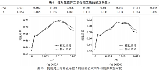 對DN25和DN200管道的模擬流量系數(shù)及經(jīng)驗公式計算結果求平均,得到針對超臨界二氧化碳工質的不同孔板邊緣尖銳度對應的修正系數(shù)b,如表6所示。將更正的修正系數(shù)應用于模擬數(shù)據(jù),結果如圖10所示。