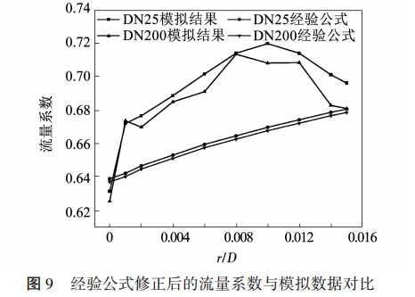 可以看出,當使用更正后的修正系數(shù)b進行孔板流量計的流量系數(shù)經(jīng)驗公式計算結果的修正后,得到的流量系數(shù)與模擬結果擬合較好,其中DN25管道相對誤差為0.11%~1.21%,DN200管道相對誤差為0.11%~1.85%。