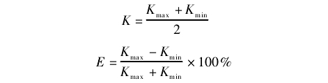 式中:K為平均流量系數(shù);E為渦輪流量計(jì)最大示值.誤差;Kmax為流量范圍內(nèi)各檢定點(diǎn)得到的系數(shù)中最大值;Kmix為流量范圍內(nèi)各檢定點(diǎn)得到的系數(shù)中最小值。