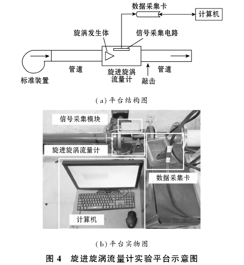 旋進(jìn)旋渦流量計(jì)實(shí)驗(yàn)平臺示意圖如圖4所示,主要由標(biāo)準(zhǔn)裝置、管道、PCle-6320數(shù)據(jù)采集卡、流量計(jì)信號采集電路和DN50氣體旋進(jìn)旋渦流量計(jì)實(shí)驗(yàn)樣機(jī)組成。