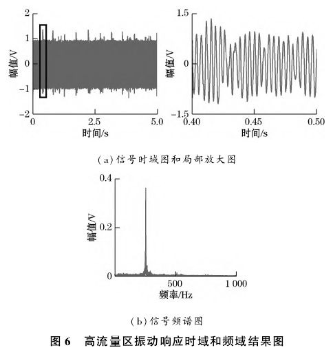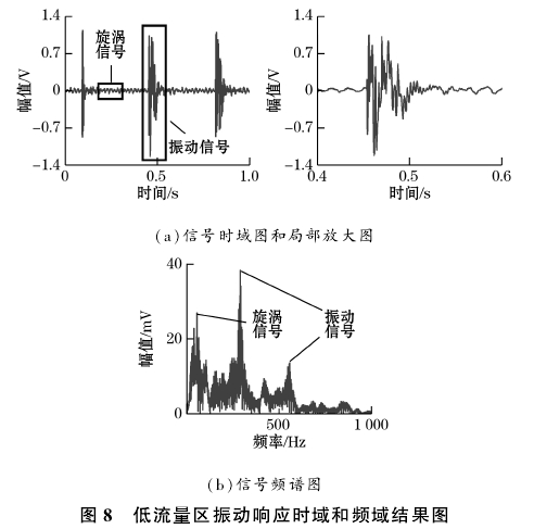 對實(shí)驗(yàn)平臺的管道施加3~4Hz的敲擊振動,得到的時(shí)域與頻域結(jié)果如圖6所示。從結(jié)果可以看出,振動信號的初始峰值與旋渦信號的幅值基本一致,同時(shí)兩者的頻譜圖基本相同,計(jì)算得到的信號頻率值為257.1Hz,與穩(wěn)定狀態(tài)下的測量結(jié)果基本--致。因此,在高流量區(qū)由于旋渦信號本身的能量較大,疊加的振動信號不會影響旋渦頻率的測量結(jié)果,可以直接通過FFT分析獲得旋渦頻率。