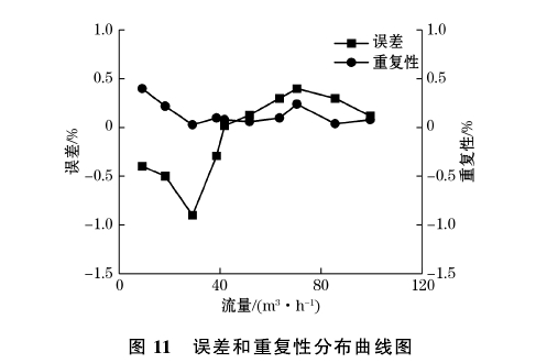 測量誤差與重復(fù)性曲線如圖11所示,低流量區(qū)的最大測量誤差和重復(fù)性分別為-0.5%和0.4%,高流量區(qū)的最大測量誤差分別為-0.9%和0.24%,根據(jù)旋進(jìn)旋渦流量計(jì)檢定規(guī)程要求,低流量區(qū)8~24m'/h最大允許誤差范圍為3.0%,重復(fù)性小于1.0%;高流量區(qū)24~120m3/h最大允許誤差范圍為1.5%,重復(fù)性小于0.5%。綜合以上分析,所有指標(biāo)均在規(guī)定的范圍內(nèi),符合旋進(jìn)旋渦流量計(jì)的性能要求。