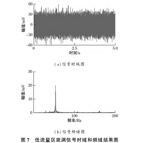 低流量區(qū)以流量點(diǎn)9.0m3/h的瞬時(shí)流量信號為例,采集得到的無振動情況下的旋渦信號的時(shí)域與頻譜圖如圖7所示,200Hz以上的信號分量基本為0,未在結(jié)果圖中展示。從結(jié)果可以看出,雖然存在一部分高頻噪聲,旋渦信號的幅值有跳動的情況,但仍然不會影響流量計(jì)的測量結(jié)果,同高流量區(qū)采用相同的方法計(jì)算信號頻率為54.0Hz。
