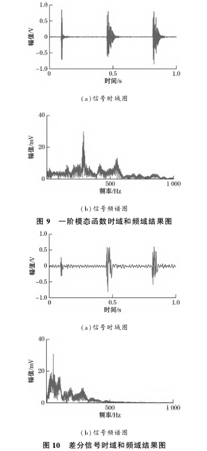 上述信號進(jìn)行分解后得到的一階本征模態(tài)函數(shù)時(shí)域與頻域結(jié)果如圖9所示。從結(jié)果可以看出,EMD處理后得到的本征模態(tài)函數(shù)基本保留了原有振動信號的所有特征,幅值較大處對應(yīng)的頻率基本--致。