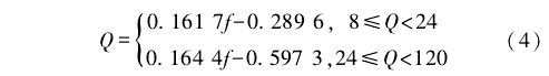 按照J(rèn)JG1121-2015《旋進(jìn)旋渦流量計(jì)》的檢定要求,對流量計(jì)進(jìn)行標(biāo)定,得到瞬時(shí)流量Q(m3/h)與頻率ƒ(Hz)之間的函數(shù)關(guān)系式如下: