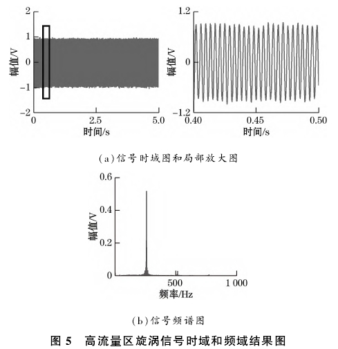高流量區(qū)以流量點(diǎn)41.7m3/h的瞬時(shí)流量信號為例。在流量穩(wěn)定的情況下完成采集并去除信號中的直流分量并進(jìn)行處理,由于對信號已進(jìn)行低通濾波處理,頻譜分析得到的結(jié)果中1kHz以上的信號對應(yīng)幅值基本為0,在圖中不做展示,得到的無振動情況下的旋渦信號的時(shí)域與頻域結(jié)果圖如圖5所示。從結(jié)果圖中均可以看出,旋渦信號近似于正弦信號,與理論分.析相符,信號頻率即為頻譜圖中尖峰對應(yīng)的頻率,通過FFT計(jì)算得到結(jié)果為258.1Hz。