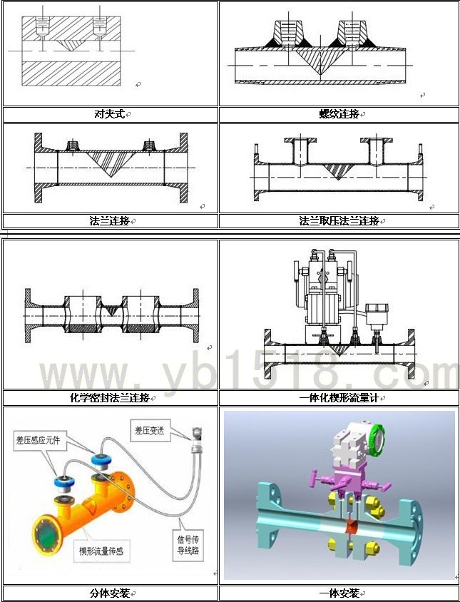 楔形流量計(jì)按其組裝方式分為一體型和分離型,按其連接方式分為法蘭連接、焊接連接、螺紋連接及對夾式連接,按其取壓方式分為普通取壓、法蘭密封取壓等結(jié)構(gòu)。詳見下表: